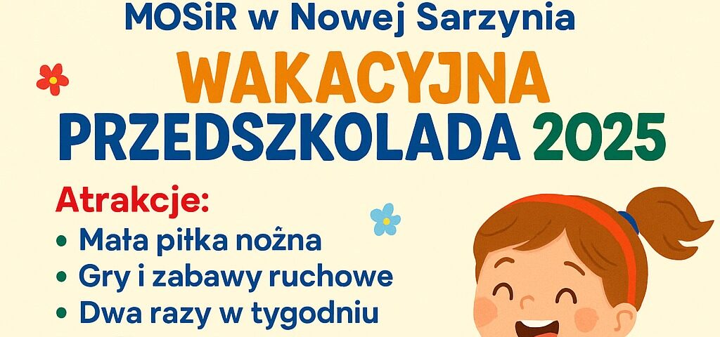 14 lipca 2025Akademia Piłkarska Młode Nadzieje w Nowej Sarzynie zaprasza dzieci do aktywnego wypoczynku wakacyjnego na obiektach MOSiR-u! Szczegóły na plakacie.